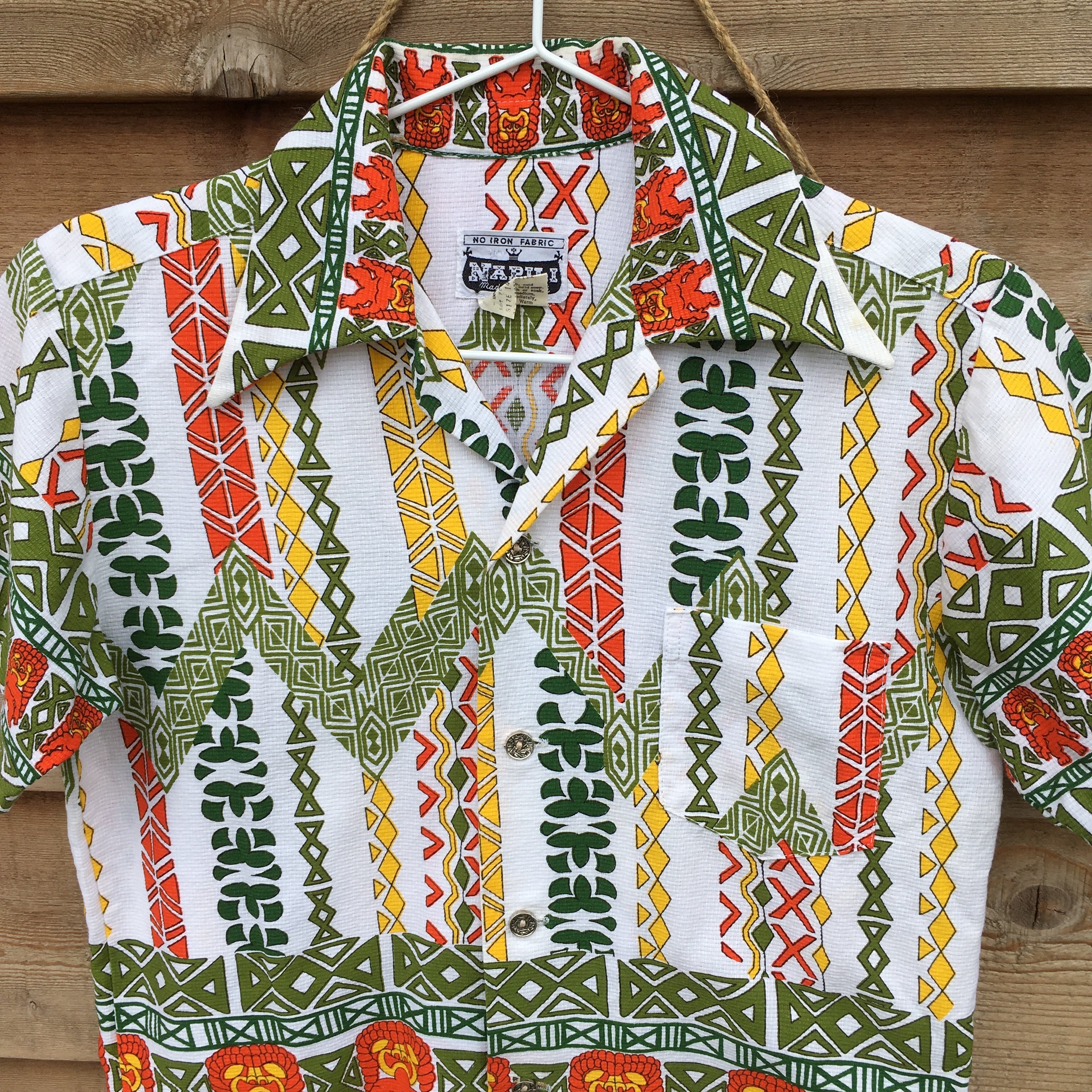ナピリ NAPILI MADE IN HAWAII ボーダー柄 ハワイアンティキ柄 ハワイアンシャツ アロハシャツ ハワイアン アメカジ
