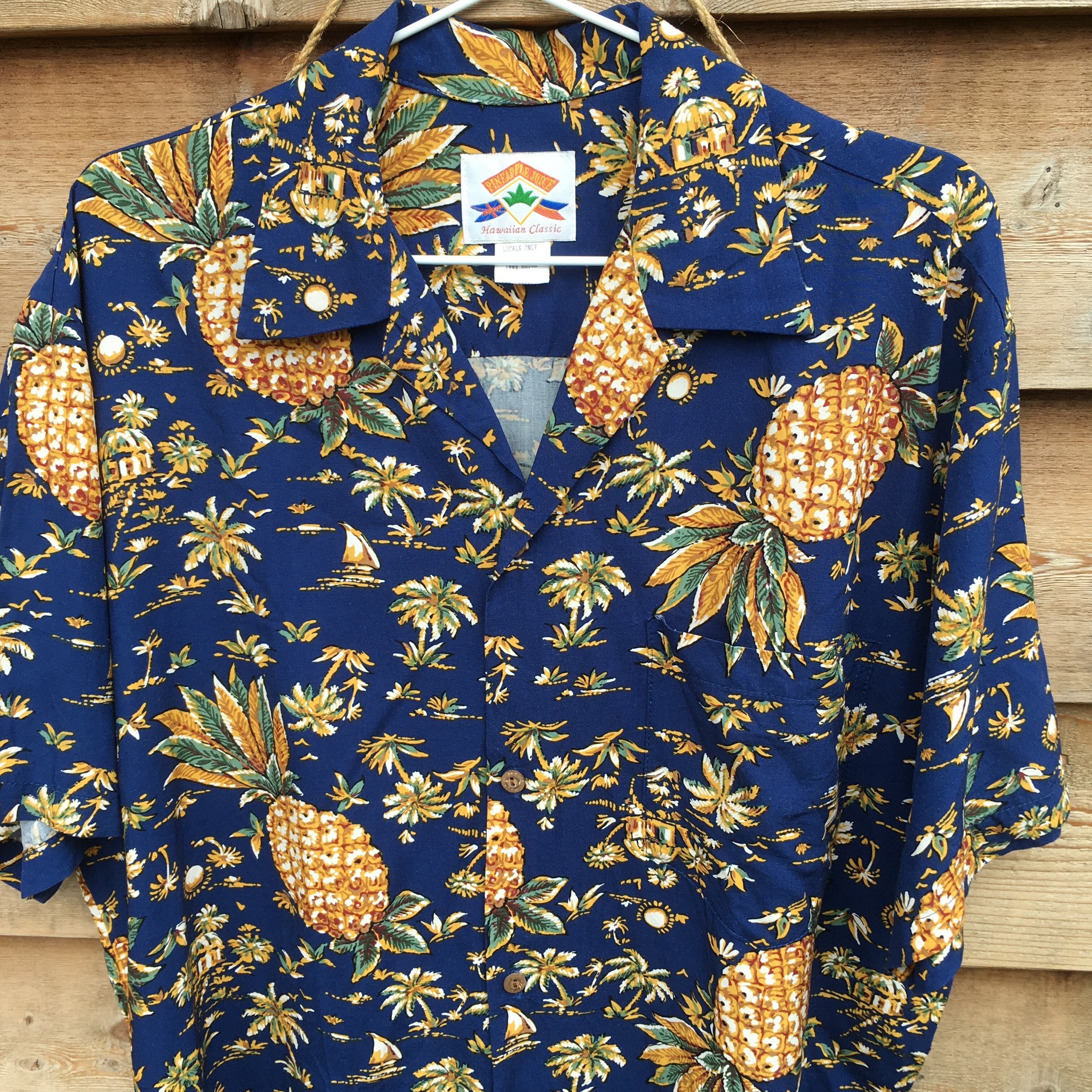 パイナップルジュース PINEAPLE JUICE MADE IN HAWAII U.S.A. パイナップル柄 やしの木柄 ハワイアンシャツ アロハシャツ ハワイアン