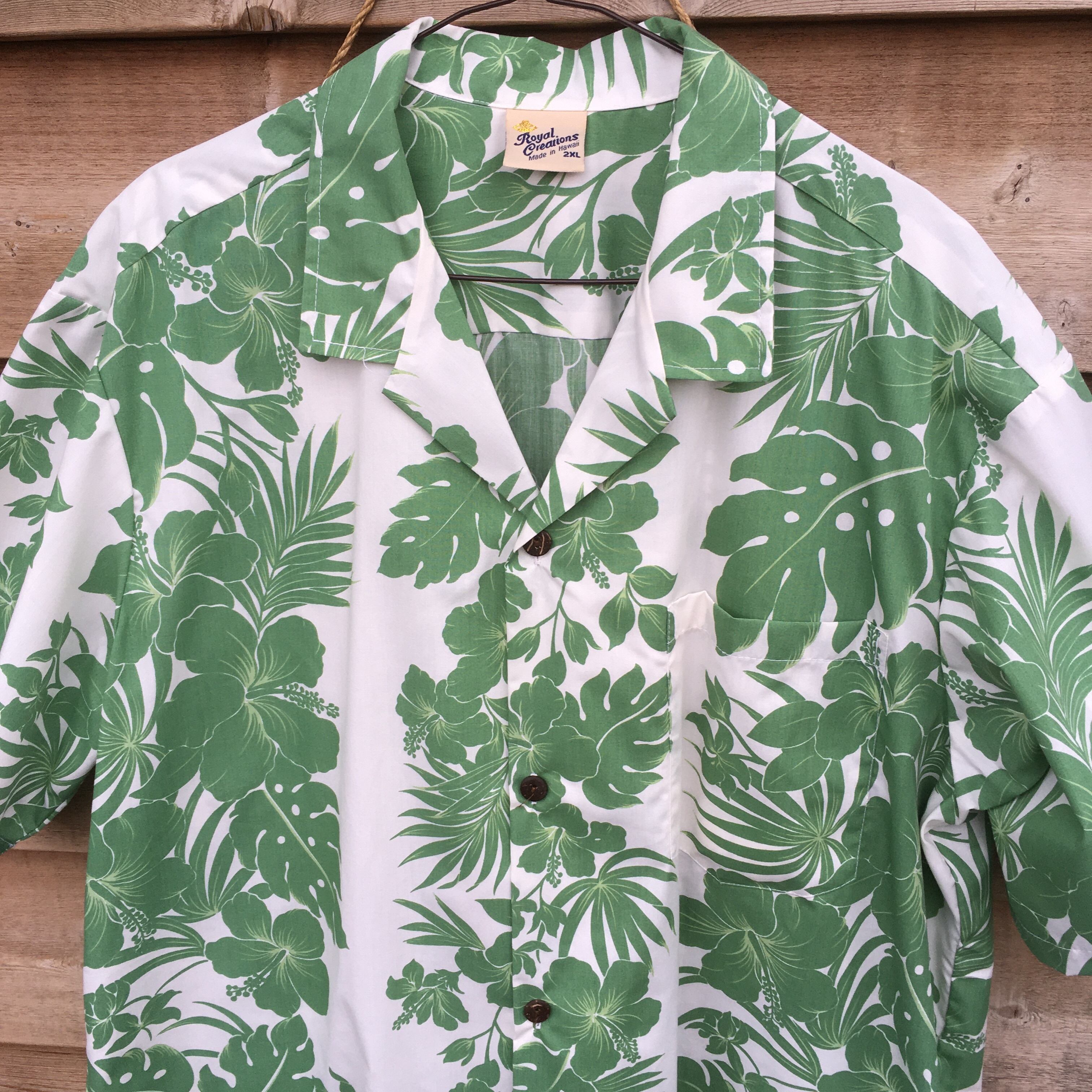ビッグサイズ ロイヤルクリエイションズ MADE IN HAWAII 2XL ボーダー柄 ボタニカル ハワイアンシャツ アロハシャツ