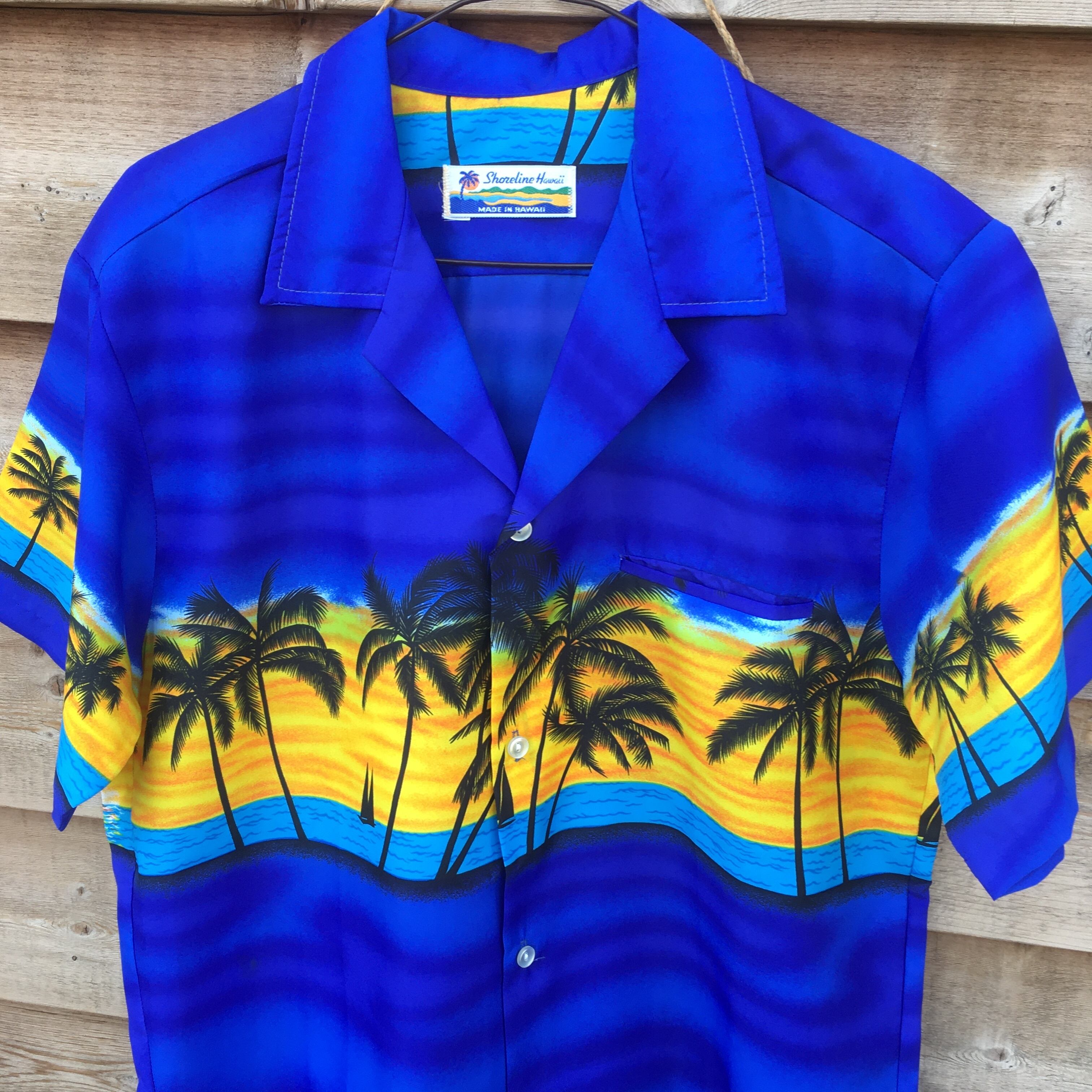 Shoreline Hawaii MADE IN HAWAII Mくらい やしの木柄 ハワイアンシャツ アロハシャツ ブルー