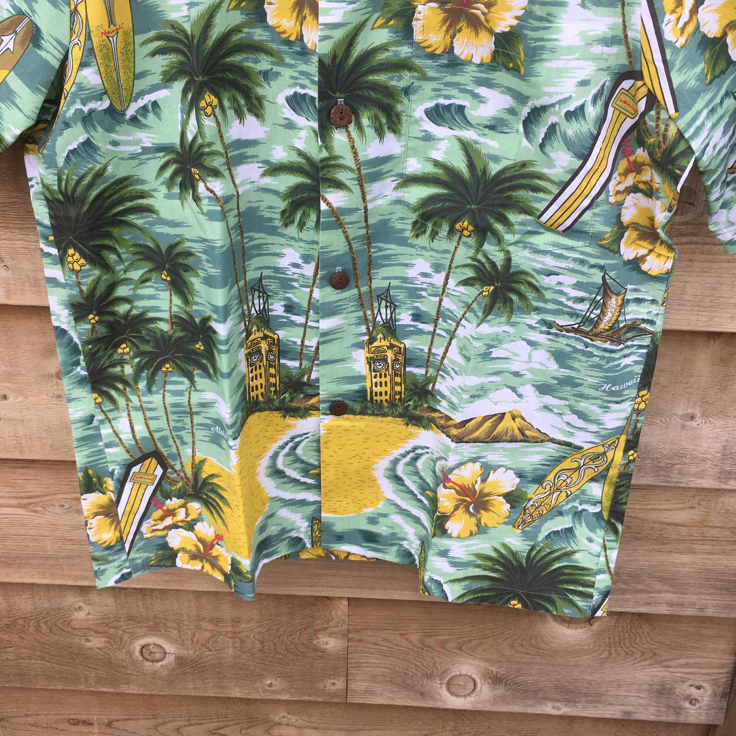 ロイヤルクリエイションズ MADE IN HAWAII S 風景柄 ハワイアンシャツ アロハシャツ グリーン