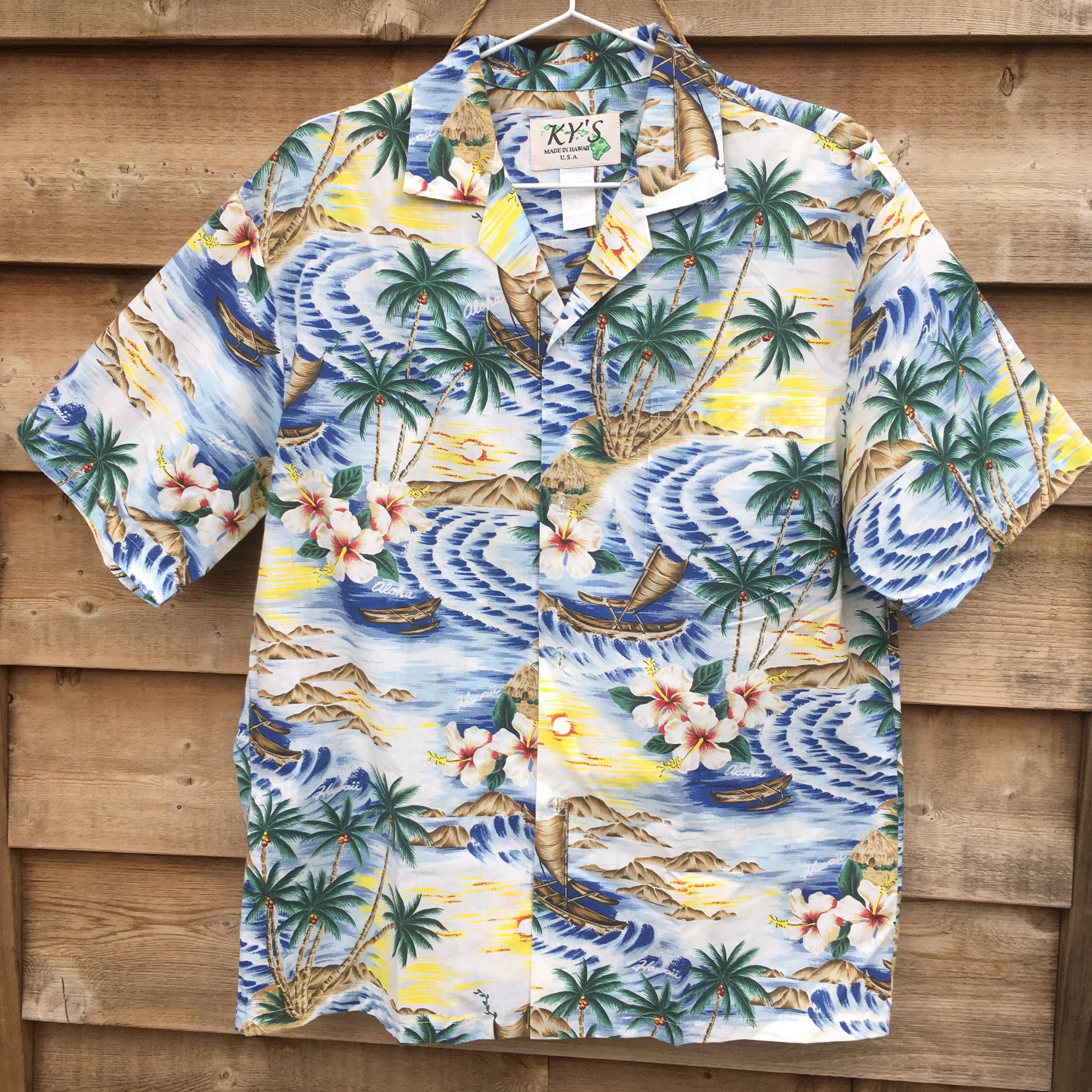 KY'S MADE IN HAWAII U.S.A. M やしの木柄 風景柄 ハワイアンシャツ アロハシャツ