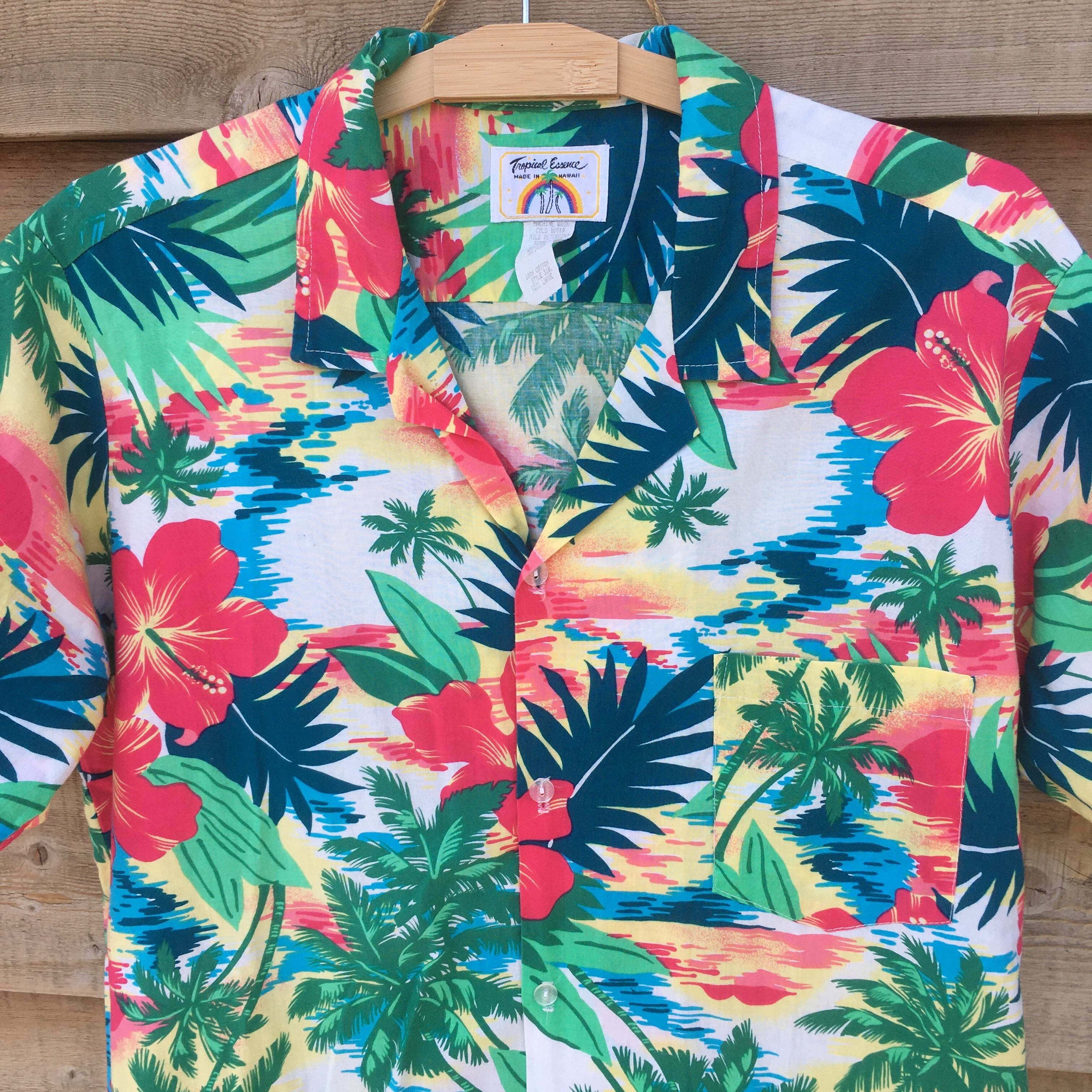 トロピカルエッセンス MADE IN HAWAII L ハワイアンシャツ アロハシャツ 花柄 やしの木柄 風景柄 ホワイト