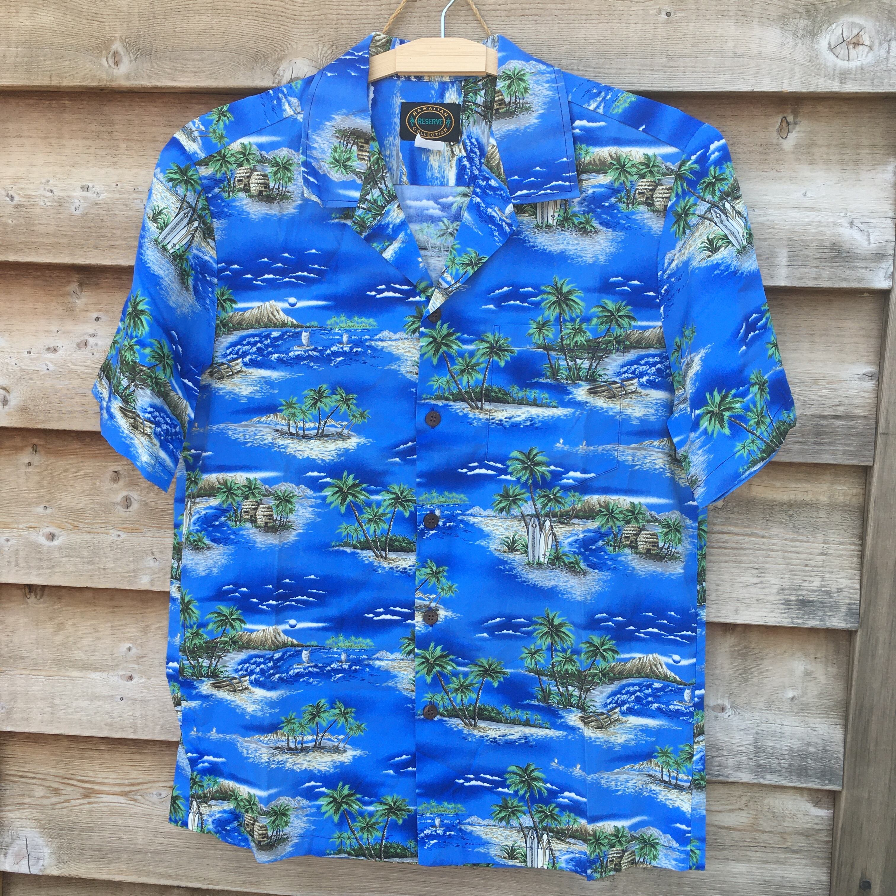 リザーブ RESERVE MADE IN HAWAII M やしの木柄 風景柄 ハワイアンシャツ アロハシャツ ブルー