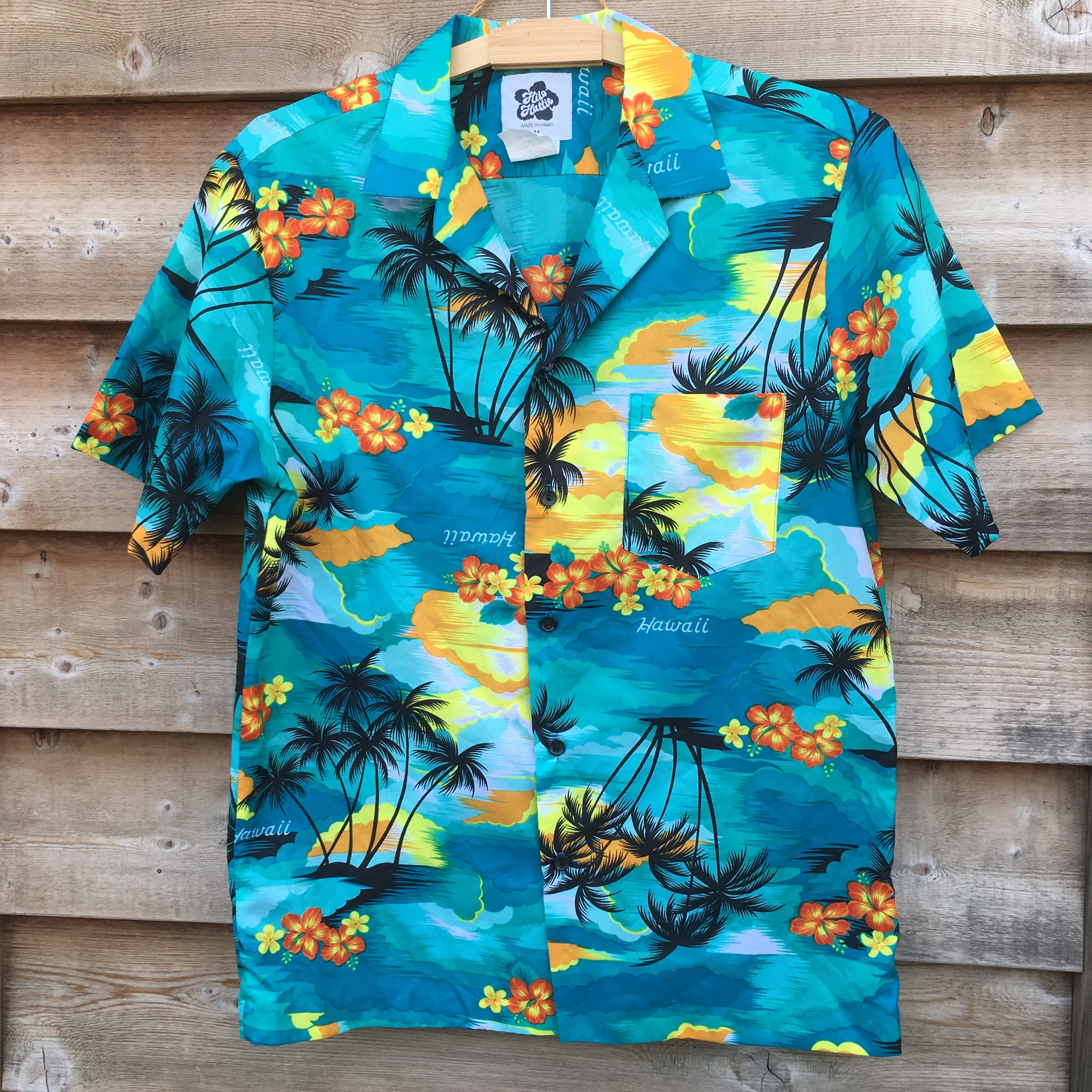 ヒロハッティ MADE IN HAMAII M ハワイアンシャツ アロハシャツ 花柄 やしの木柄 グリーン