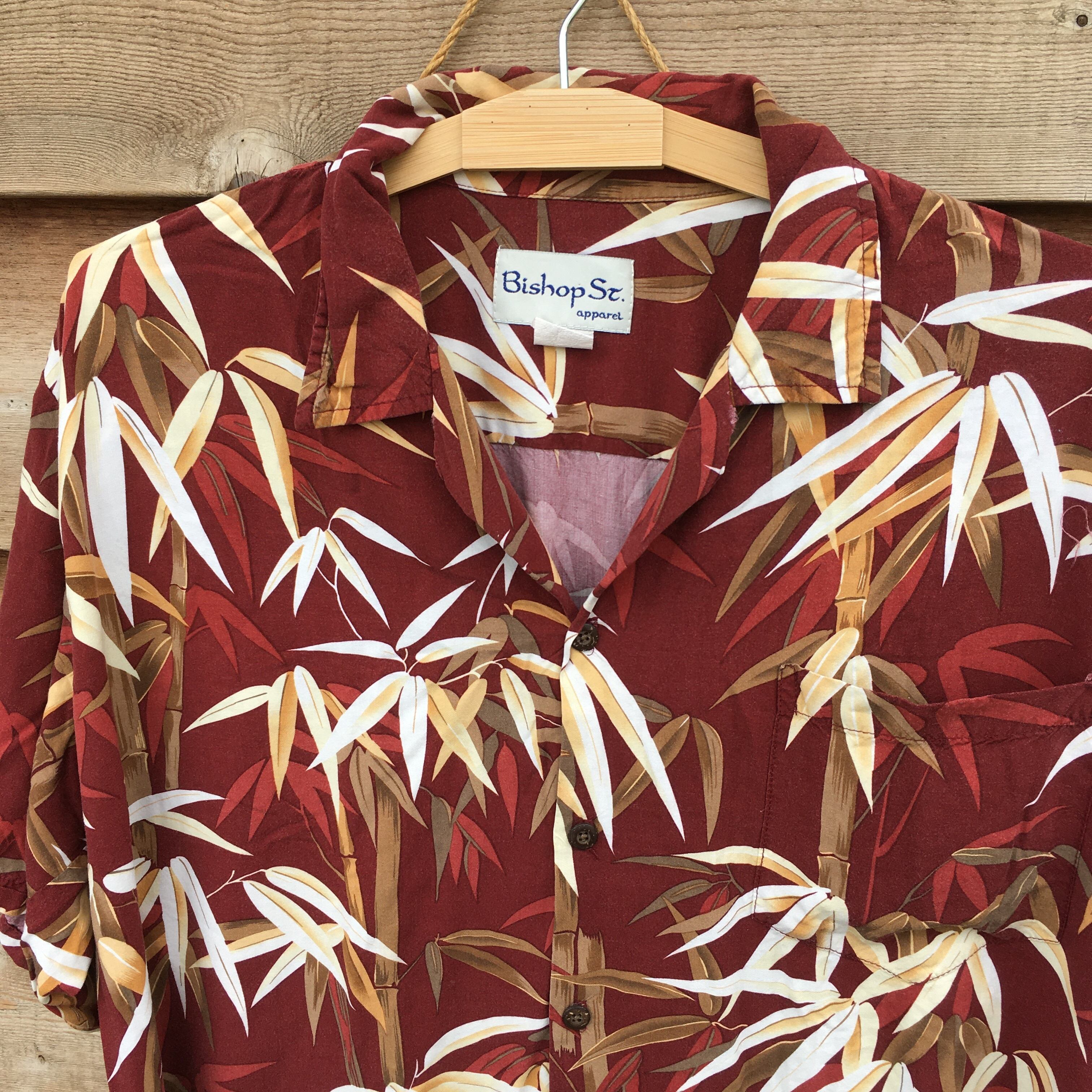 Bishop St. MADE IN HAWAII L アロハシャツ ハワイアンシャツ バンブー柄 ボルドー