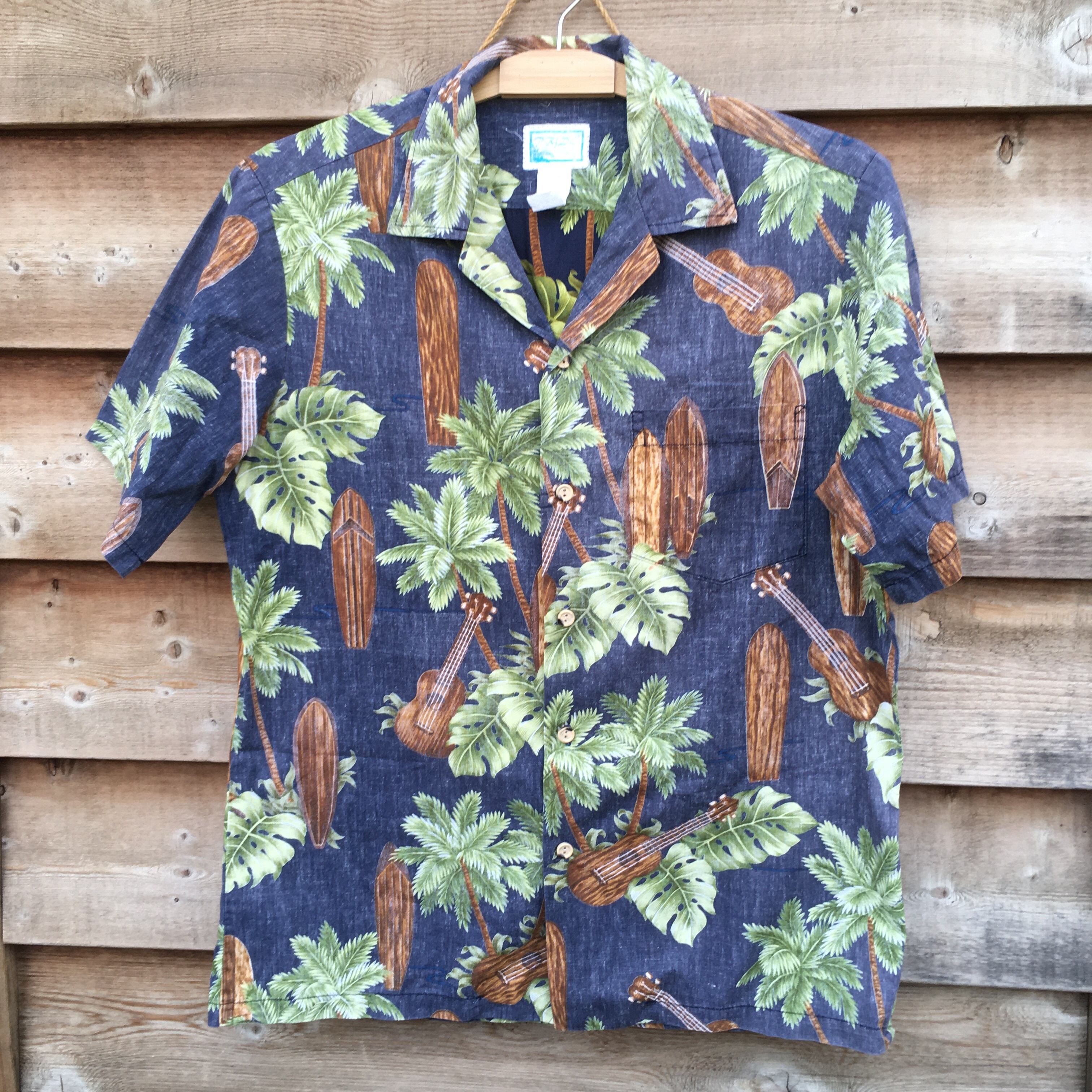 プライド MADE IN HAWAII S アロハシャツ ハワイアンシャツ 裏使い サーフボード柄 やしの木柄 ネイビー