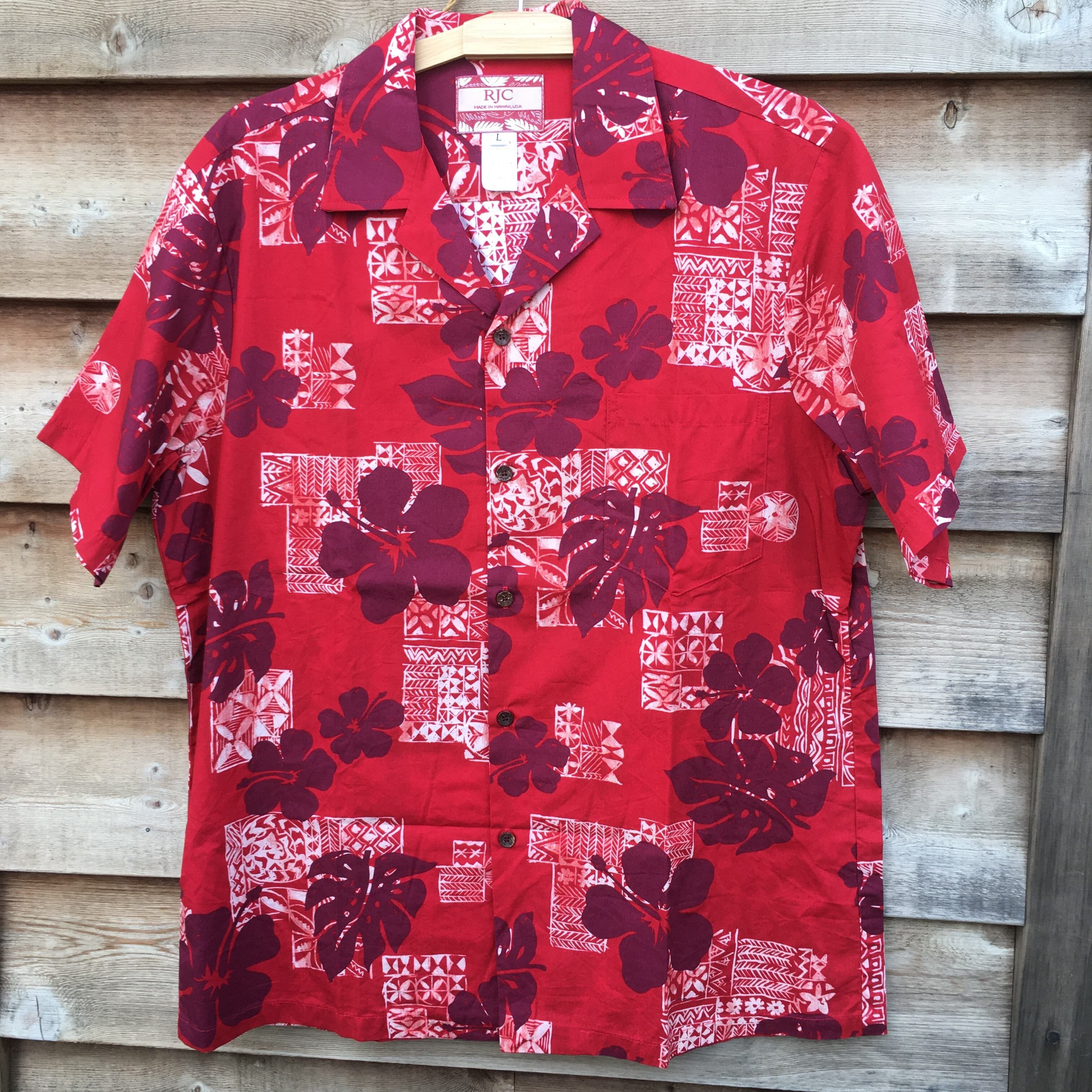 RJC MADE IN HAWAII U.S.A. L アロハシャツ ハワイアンシャツ 花柄 リーフ柄 レッド